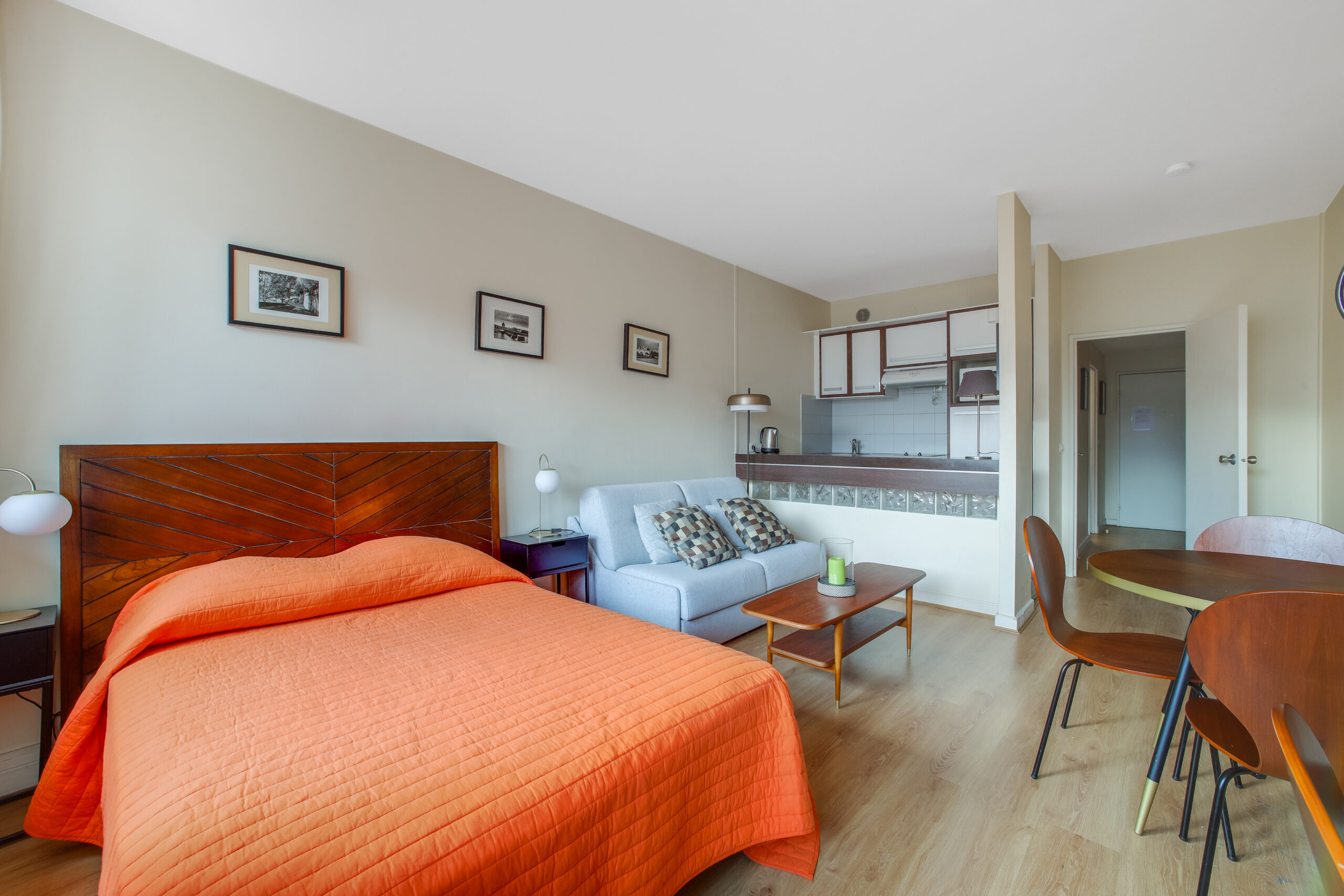 une entrée avec rangements sur mesure, un séjour avec cuisine ouverte équipée offrant une belle vue dégagée sur cour, 2 chambres avec rangements et une salle d’eau avec wc